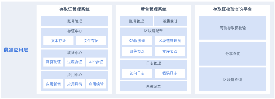 本方案提供了存取證管理系統(tǒng)、后臺(tái)管理系統(tǒng)、存取證查詢校驗(yàn)平臺(tái)三個(gè)系統(tǒng)。