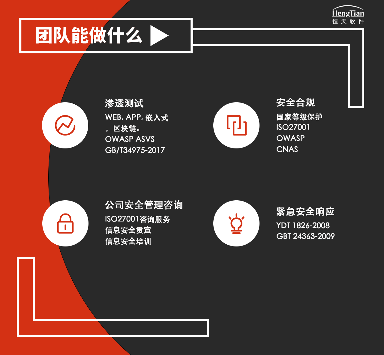 主要為國內(nèi)外客戶提供Web系統(tǒng)安全評估、高級滲透測試、緊急安全響應(yīng)等服務(wù)以及自動化安全測試系統(tǒng)等服務(wù)。團(tuán)隊擁有中國合格評定國家認(rèn)可委員會(CNAS)的實驗室認(rèn)可證書,團(tuán)隊安全專家已獲得CISP(信息安全人員國家級最高資質(zhì)),CIIP-A(國家信息安全等級保護(hù)認(rèn)證)等資質(zhì)。