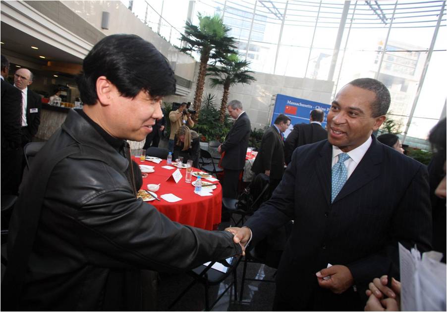 Deval Patrick shook hands with a Chinese businessman at Tsinghua University in Beijing, China, during a 2007 trip.