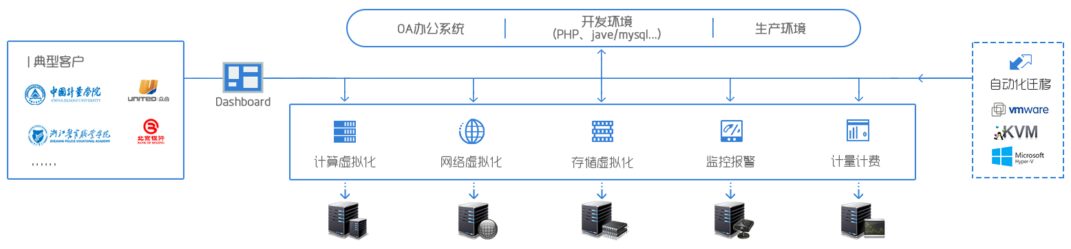 圖二:恒天云企業(yè)級私有云平臺架構圖恒天云是一款致力于打造高效企業(yè)級私有云、基于OpenStack進行深度二次開發(fā)的云操作系統(tǒng),不僅致力于進行OpenStack、虛擬化平臺、操作系統(tǒng)、調(diào)度算法的優(yōu)化,同時兼顧開發(fā)恒天云智能服務門戶,全面滿足企業(yè)云化的需求,幫助企業(yè)打造自己的云計算生態(tài)系統(tǒng)。恒天云高效、可配置的工作流機制使用戶的IT管理工作輕松自如,用戶提交的資源申請只需經(jīng)過管理人員的審批,便可自動進入資源創(chuàng)建流程;平臺還對外提供可編程接口,可以方便地與第三方系統(tǒng)進行對接。 同時,恒天云提供自動化遷移工具,提供V2V遷移,即虛擬機到虛擬機的遷移,以及P2V遷移,即遷移物理服務器上的操作系統(tǒng)及其上的應用軟件和數(shù)據(jù)到 VMM管理的虛擬服務器中。值得一提的是,恒天云利用PXE和KickStart的技術,工作于Client/Server的網(wǎng)絡模式,支持工作站通過網(wǎng)絡從遠端服務器下載映像,并由此支持來自網(wǎng)絡的操作系統(tǒng)的啟動過程,其啟動過程中,終端要求服務器分配IP地址,再用TFTP或MTFTP協(xié)議下載一個啟動軟件包到本機內(nèi)存中并執(zhí)行,整個過程基本實現(xiàn)無人值守、批量部署的方式,大大縮短數(shù)據(jù)中心云化改造的工作周期。