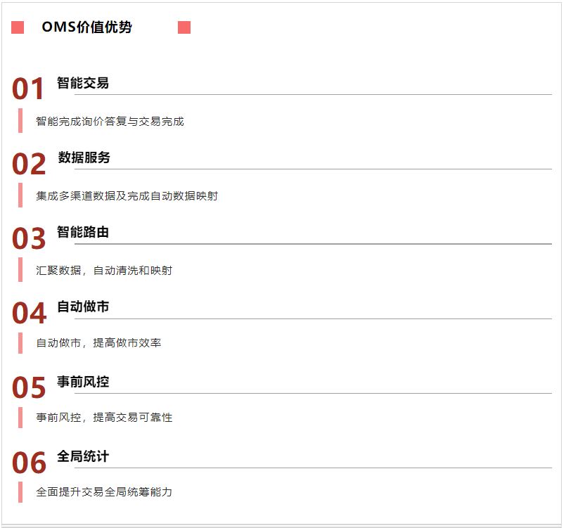 恒天OMS產(chǎn)品不僅具備智能交易管理功能,同時包含自動做市、事前風(fēng)控、多數(shù)據(jù)集成、全局統(tǒng)計等亮點(diǎn)服務(wù),靈活集成外部各類行情和上下行交易接口的同時能有效控制交易風(fēng)險,智能分發(fā)交易路由,靈活處理交易分倉,實現(xiàn)交易的一站式智能處理!
