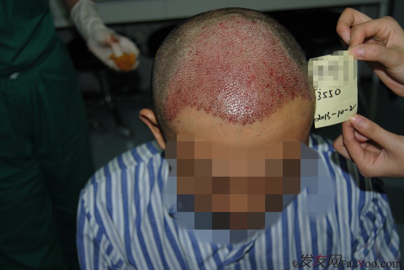 植發(fā)前:2號早上一早到醫(yī)院,因為1號安排好手術了,全員都準備好了。一去就給我推了個光頭,換了衣服。6。7個人(原諒我也沒注意具體是幾個,好像是6到7個人)從早上快10點一溜做到下午4點鐘左右,6個小時都沒吃飯。聽主刀的王主任說按我這個3500發(fā)量的,6小時做完算快的了。期間的手術痛苦就不跟發(fā)友們分享了,打麻藥的時候真心疼,想起都疼。